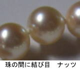 また、ナッツ仕上げと言って、留金に近い数個の珠と珠の間に結び目を作り、万一、糸が切れても珠がバラケないような糸替えもあります