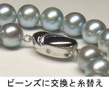 連組したパールの糸の両端に留め金用のエンドパーツを付けて、それとビーンズをジョイントするので、留金の取換えと糸替えはセットになります