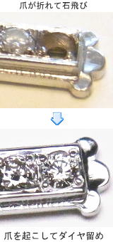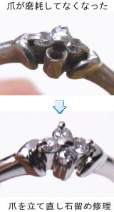 修理方法は、4本爪を立て直して、新しいメレダイヤをご用意して留めなおす